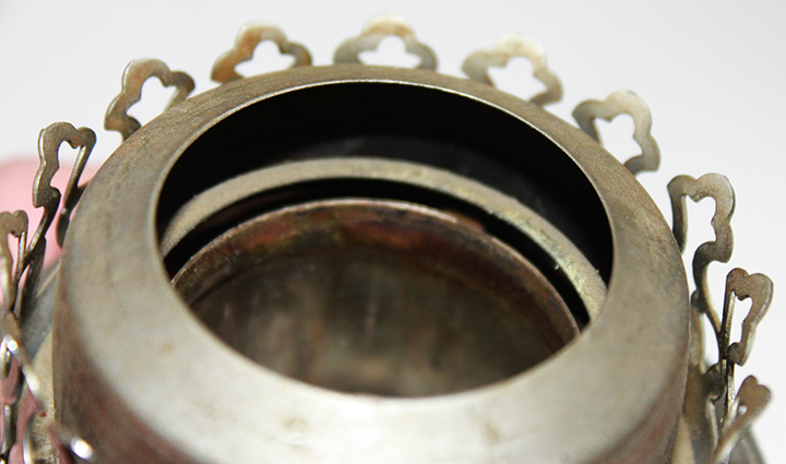 Here you can see the air gap between the outer wick tube and the brass "L" shaped ring at the top of the gallery base piece. There is a second outer air gap between the Gallery top part and the brass "L" shaped ring.