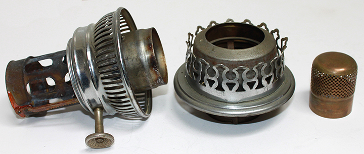 In the pictures above and below you can see a brass cylinder that is tightly wedged inside the inner wick tube. The flame spreader is slightly larger in diameter on the top half starting just below the lowest row of holes.