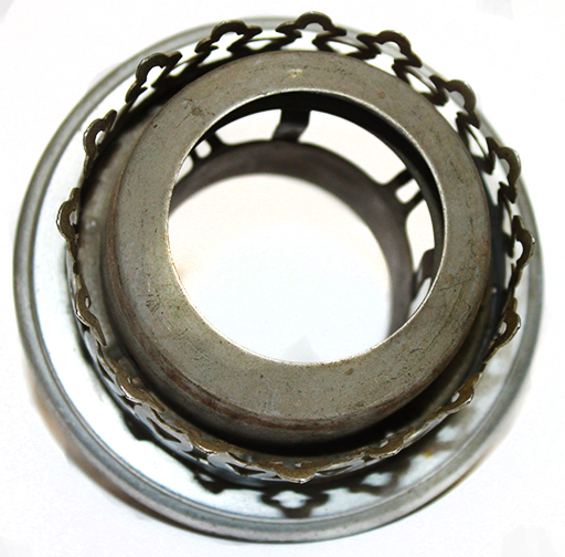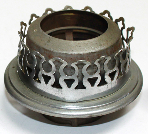 Burner basket from above showing the simple construction of the burner. The triangular points facing in from the wick carrier holds the wick tight between the inner and outer tubes.