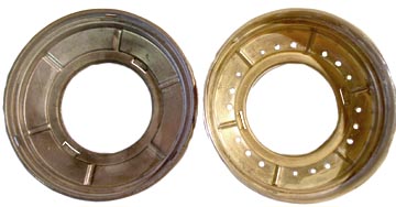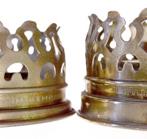 The pictures above show the latch used on the hanging lamp bottom ring for the model 2 through most of model 4. The model 1 used a different latch and a different latch was introduced late in model 4 production. The Aladdin wall mounting brackets used the same pattern on the ring as the hanging lamps. |